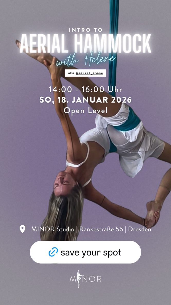 In diesem Workshop erlernst du luftakrobatische Basics und erste Figuren im Aerial Hammock, die anschließend zu einer fließenden, kurzen Sequenz verbunden werden. Dich erwartet ein ausgewogener Mix aus Technik (Kraft, Körperspannung, Flexibilität), kreativer Bewegung und Freude am Tuch, in einer motivierenden und offenen Atmosphäre.